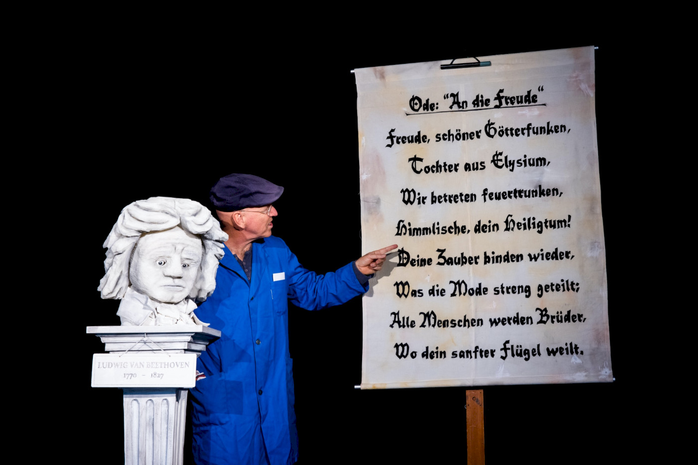 So erzählt Beethoven aus seinem Leben, von seiner Kindheit und seiner Familie, über seinen Umzug nach Wien, über seine Erfolge und über seinen Kampf mit dem Schicksal, insbesondere mit seiner Schwerhörigkeit. Beethoven in all seiner Widersprüchlichkeit: kraftvoll und zart, wütend und leidenschaftlich, verzweifelt und mitreißend. Geschichten zu den bekannten Melodien, wie „Für Elise“, die Pastorale aus der 6. Symphonie oder dem Ohrwurm der 5. Symphonie werden erzählt und schließlich erfahren die jungen Zuschauer auch was es eigentlich mit den „schönen Götterfunken“ auf sich hat.